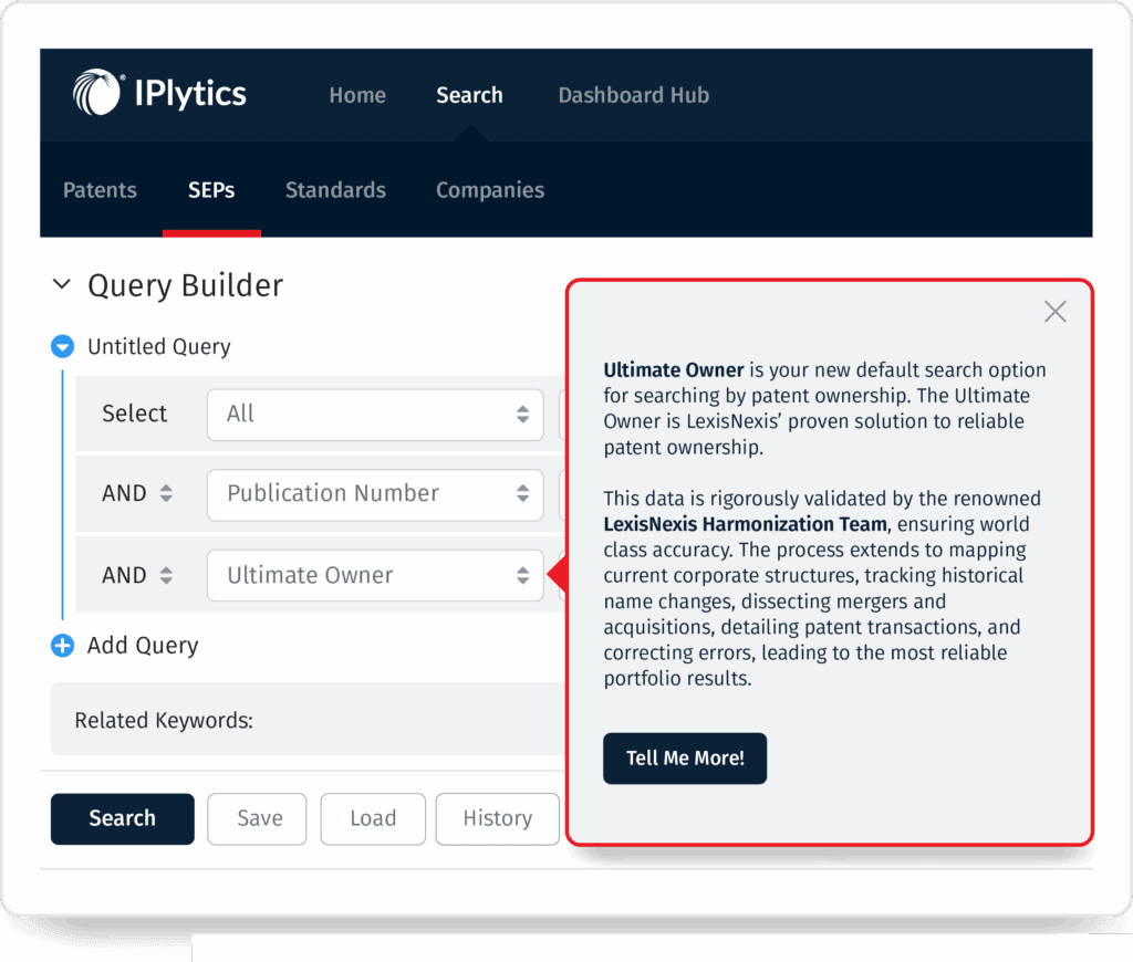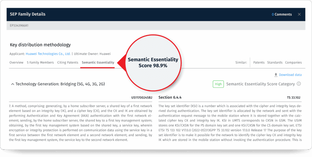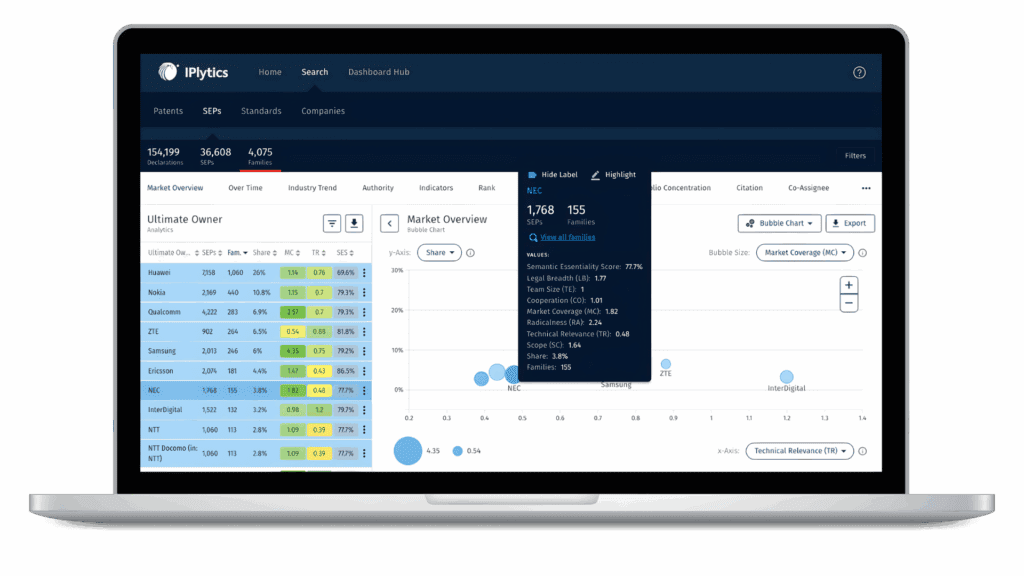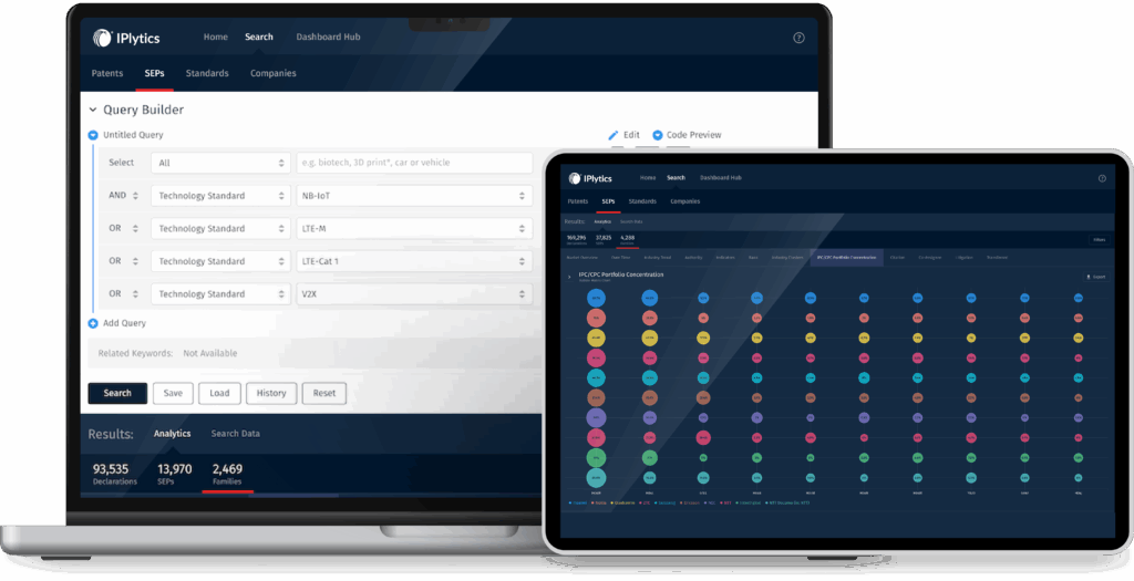 Home > IP Solutions > IP Analytics & Intelligence > IPlytics A lawyer or a judge advisor works in the legal concept office. Navigate the World of Standard Essential Patents and Standards’ Contributions Leverage transparent and accessible data for SEPs, Technical standards, and contribution data analysis to ensure the success of your patent portfolio with LexisNexis® IPlytics. REQUEST A MEETING Turn patents and standards data into action and make profound business decisions As a patent professional, you can enhance the performance of your patent portfolio by utilizing IPlytics’ reliable and user-friendly data on SEPs, technical standards, and contribution data analysis. Access transparent and easily understandable insights, empowering you to make informed decisions and achieve success. Watch the video Who is Leading the 5G Patent Race? Discover the true leaders in 5G innovation and the patent landscape for 2026 through verified patent analysis powered by Cellular Verified Initiative. Read the Report Semantic Essentiality Score Your first step to determining patent essentiality The IPlytics Semantic Essentiality Score guides you on how likely essential a patent is to the standard it is declared for. Using a semantic mapping of independent patent claims to standard sections, an essentiality score is calculated ranging from 1-100 with 100 being the most likely essential. get the details Mapping undeclared SEPs in key technologies Cellular (2G, 3G, 4G, 5G) Cut through complexity in 2G, 3G, 4G, and 5G patents using accurate, industry-validated data. learn more Cellular IoT(NB-IoT, LTE-M, Cat1, V2X Explore how we mapped Cellular IoT patents across NB-IoT, LTE-M, Cat 1 and V2X technologies. learn more Wireless Charging (Qi1 & Qi2) Learn more about our comprehensive technology landscape of Qi-related patents. learn more Video (AVC, HEVC, VVC, AV1, VP9) Navigate the evolving video codec patent landscape with clear, data-driven insight. learn more Audio (AAC, OPUS, MPEG-H, EVS, IVAS) Unlock visibility into declared and undeclared audio codec patents for smarter licensing and risk decisions. learn more Wi-Fi(3,4,5,6,7) Gain clarity across Wi-Fi 3, 4, 5, 6, and 7 patents with trusted insight to evaluate exposure and unlock new opportunities. learn more Get a holistic view of patent ownership within the realm of SEPs Ultimate Owner is a game-changing addition to IPlytics that promises to revolutionize the way you navigate the SEP landscape. At its core, the Ultimate Owner concept recognizes that parent companies often exert control over patents held by subsidiaries, joint ventures, and affiliates. This concept equips you with the tools to make informed licensing, negotiations, and portfolio management decisions. get the details Overcome complexity in data-led decisions Standard Essential Patents Access to ownership information of patents declared to worldwide standards Standards Contribution Explore companies’ technology investments in standards Litigation Cases Gain insights on market disputes on patented technology through litigation cases Patent Pools Be informed about the accessibility of SEP-protected technology Semantic Essentiality Determine standard essentiality of declared patents Industry Report Who is Leading the Wi-Fi 6 Patent Race? download the pdf Industries we empower with actionable insights Telecommunications Build accurate declared SEP landscapes for a variety of standards and learn how essential the respective SEP holder portfolios are. Automotive Quickly understand your risk exposure. Level the playing field using the same data and metrics in licensing negotiations as the licensors. Consumer Electronics Monitor the landscape of connectivity standards and patents to prepare for your next connected product release while avoiding unnecessary risk. Law Firms Position yourself as a leading expert in all related SEP matters by having dynamic, real-time SEP data at your fingertips, whether for litigation support or additional client service projects and questions. Patent Pools Efficiently evaluate portfolios. Proactively find new patent pool members with valuable assets. Want to explore the IPlytics Platform? Get in touch The Patent Intelligence Platform to make FRAND License Negotiation in your favor and determine essentiality likelihood before you make decisions. REQUEST A MEETING How top professionals use IPlytics SEP licensors Align your standards development, patent prosecution, patent portfolio management, and licensing/monetarization strategy to file valid and essential patents and to commercialize SEPs in worldwide licensing campaigns. Value and benchmark your SEP portfolio for cross-license negotiations and monitor competition. Examine competitors’ standards development investments and identify new standards initiatives to maintain leading positions in standards development. Patent portfolio managers Identify the strengths and weaknesses of your SEP portfolios and benchmark it against your competitors. Measure and track your market share for standards such as 4G, 5G, Wi-Fi, video codec (HEVC/VVC), and many more. Support keeps/kills decisions to further develop your SEP portfolio. Licensing executives & Dealmakers Value your SEP portfolio to weed out ‘weaker’ patents, focusing resources on higher-ranked patents. Find gold nuggets in your portfolio to identify patents to license or sell. Monitor the market and track ownership changes and litigation trends. SEP licensees Value and determine SEP portfolios offered for license. Prepare for FRAND negotiation and identify the numerator and denominator to measure patent holders’ market share. Identify standards subject to SEPs in the complex product value chain of suppliers. Monitor SEP filing, SEP change of ownership, and litigation to quantify risks and plan royalty payments. Identify industry-related (e.g. V2X, NB-IoT, M2M) standards initiatives to have a seat at the table when future connectivity technology is develope